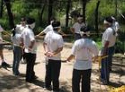项目简介:所有队员在蒙住眼睛的环境中(盲人),在40分钟内把一团绳子拉成一个最大的正方形,并将所有队员平均分配到正方形的四条边上。