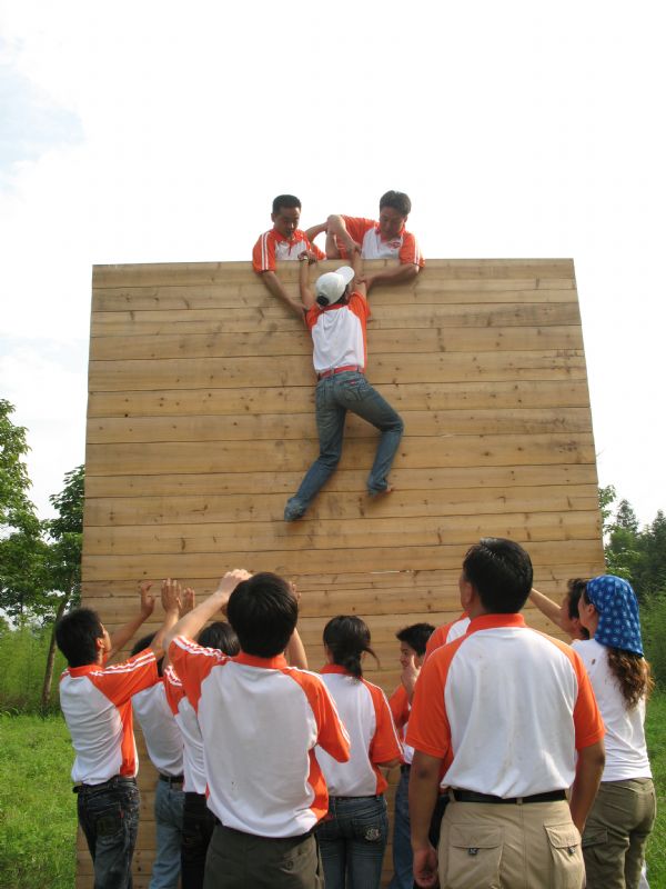 项目介绍:全队所有成员在规定的时间内翻越一面高4.2米的光滑墙面,