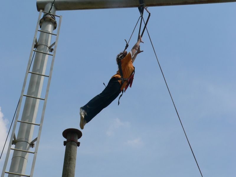 项目简介:每一位学员都要独立爬上9米 高的高台,并在直径仅为25公分的圆盘上站立,然后从圆盘上奋力越出,去抓住横在空中的单杠。