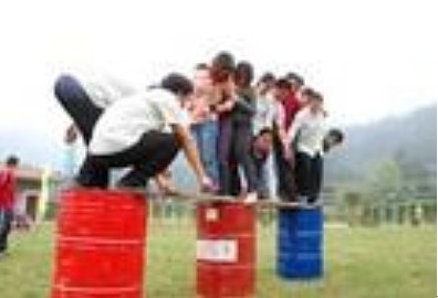 项目简介:所有队员站在两块10米长的模板上,两块模板架在三个高1.2米的铁桶上,人不准落地,模板不能落地,在40分钟内移动铁桶