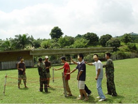 项目简介:三个人中有两个“盲人”(蒙住眼睛),另外一个人在一定距离内用语言指挥盲人,通过由绳索编制的高低不等的障碍,盲人